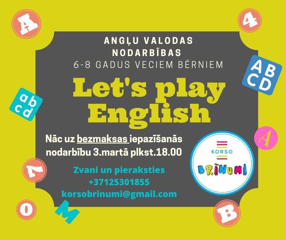 Aicinām jūs apmeklēt bezmaksas angļu valodas iepazīšanās nodarbību galerijas Korso (Jomas iela 37, Jūrmala) otrajā stāvā. Nodarbība paredzēta 6-8 gadus veciem bērniem, kas vēlas caur jautrām spēlēm un dziesmām mācīties angļu valodu. Nodarbība notiks angļu valodā un to vadīs sertificēta pasniedzēja no Krievijas ar ilggadēju pieredzi darbā ar bērniem.