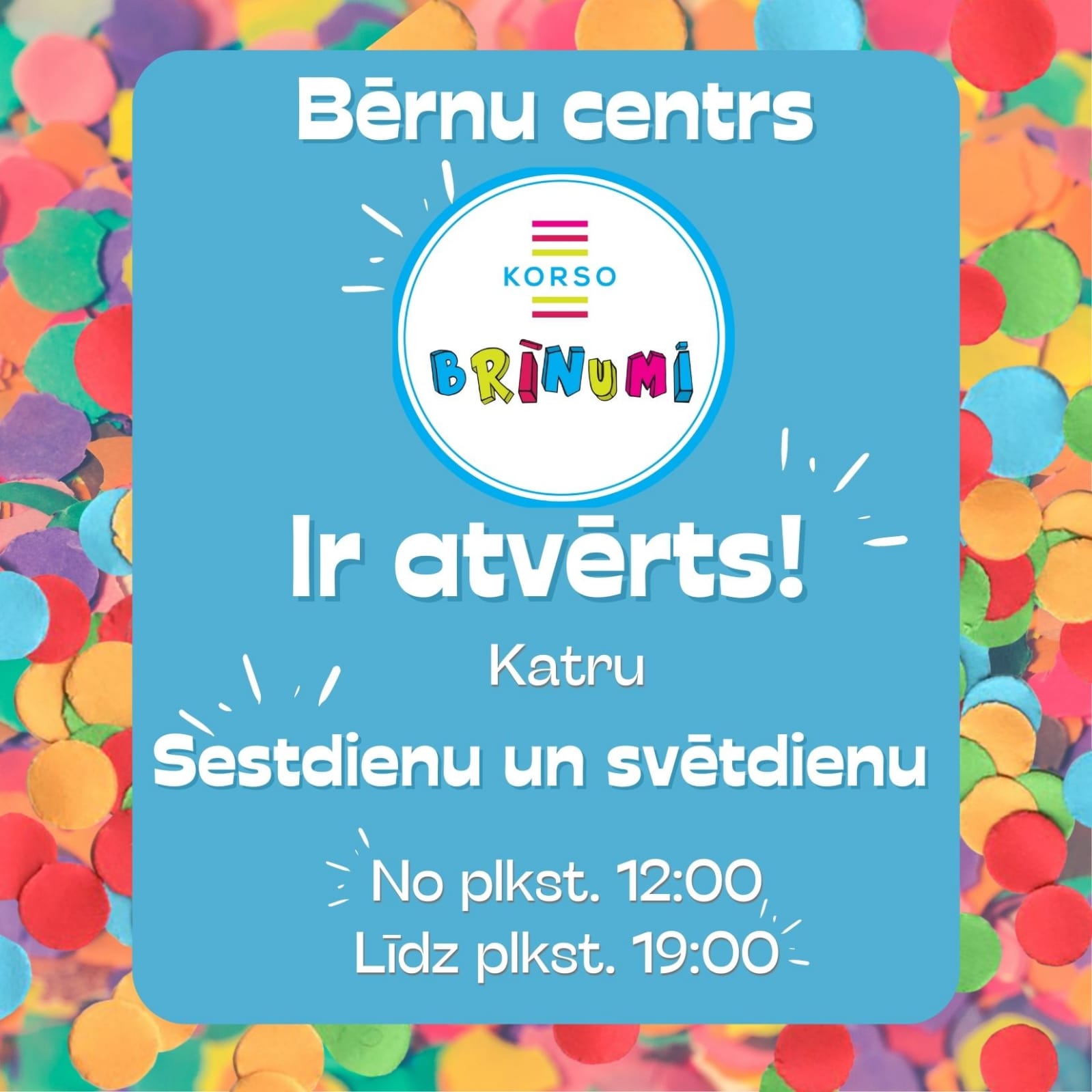 Bērnu centrs "Korso Brīnumi" ir atvērts visiem apmeklētājiem, katru brīvdienu no plkst. 12:00 līdz 19.00. Mūsu centrā ir pieejamas izklaides jebkuram vecumam, tādas kā: Xbox kinect; Galda teniss; Gaisa hokejs; Bumbiņu baseins; Būvmodeļi; Kinētiskās smiltis; Dažādas galda spēles u.c. Ieejas biļete - 7€