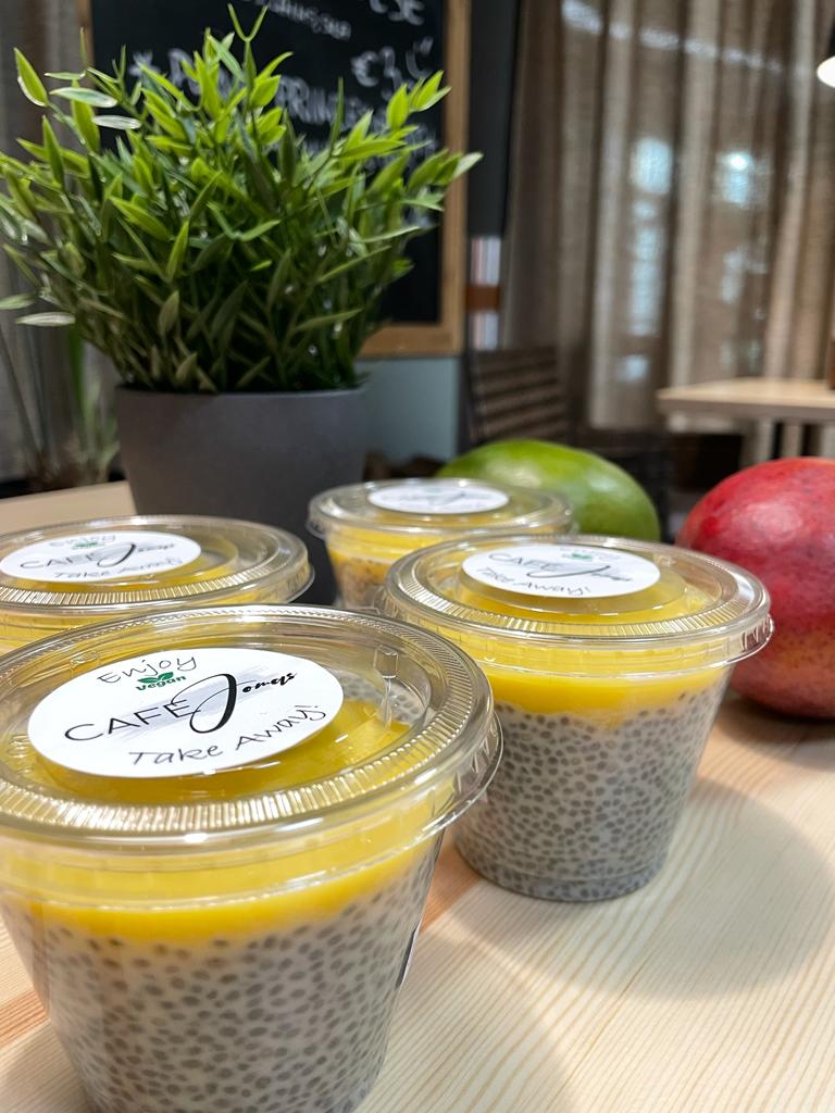 Jaunums Cafe Jomas desertu plauktā - Chia sēklu pudiņš ar sojas pienu un svaigi blendētu mango bez laktozes, vegāns. Īpašo piemērots, kad gribas ko saldu, bet veselīgu un sajūtu, ka gribas vēl.