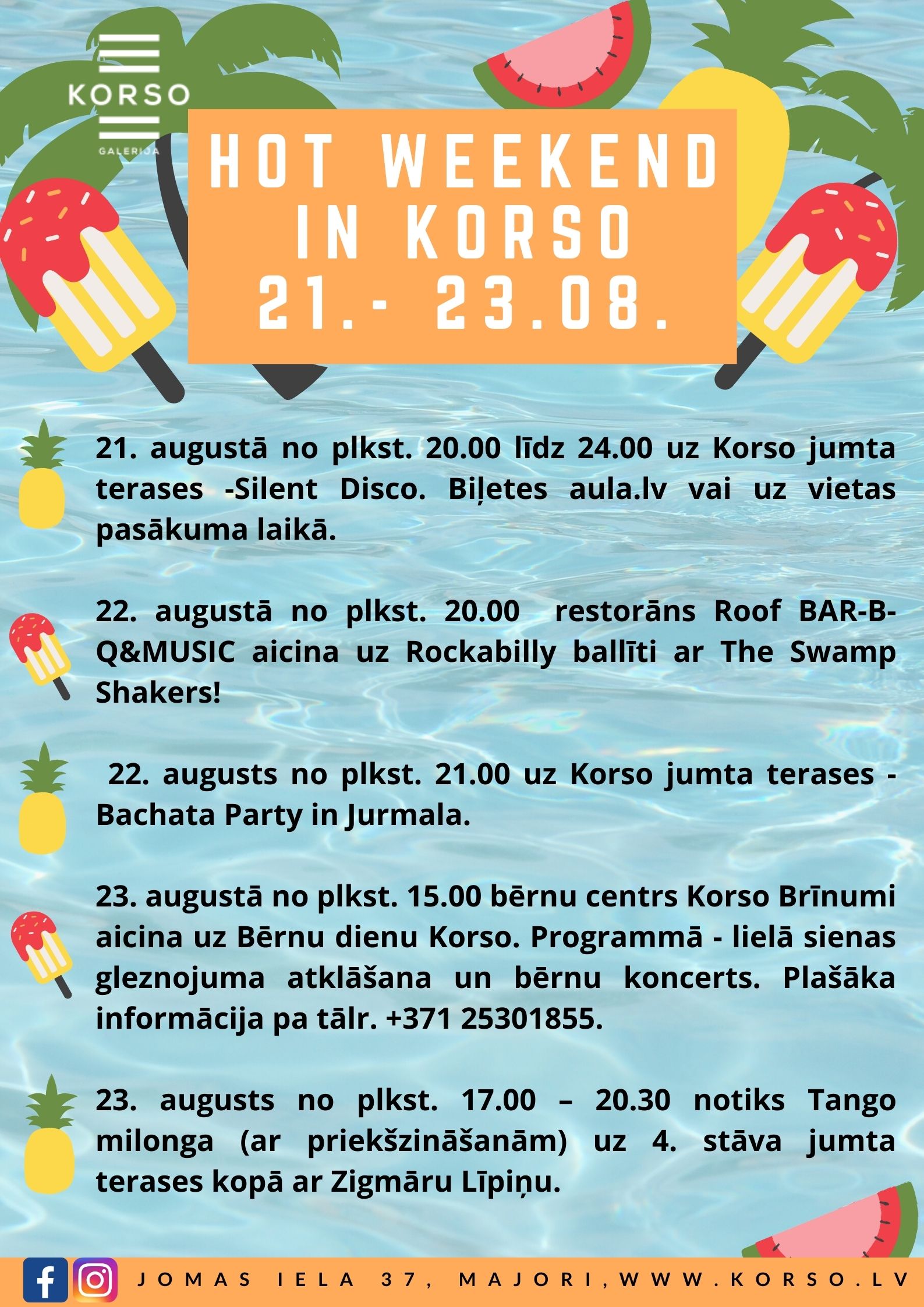 • 21. augustā no plkst. 20.00 līdz 24.00 uz Korso jumta terases - Silent Disco. Biļetes aula.lv vai uz vietas pasākuma laikā.