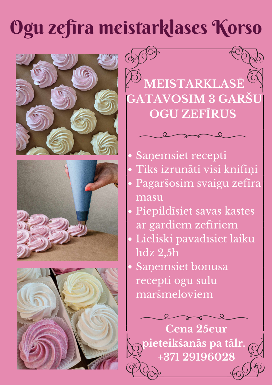 Ņemot vērā lielo pieteikumu skaitu, izziņojam vēl divus datumus Ogas Kārums vadītajām zefīra meistarklasēm - 27.oktobrī plkst. 18.00 un 28. oktobrī plkst. 12.00. Norises vieta t/c Korso 2. stāvā, Jomas iela 37, Majori, Jūrmala.