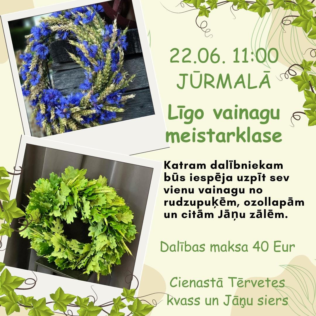 Tiekamies Līgo vainagu meistarklasē 22.06. plkst. 11.00. Jomas iela 37, 2. stāvā. Nepieciešama iepriekšēja pieteikšanās, jo vietu skaits ir ierobežots.