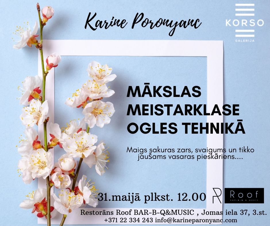 maijā plkst. 12.00 ROOF Bar-B-Q & MUSIC restorānā notiks mākslas meistarklase ogles tehnikā, kuru vadīs pazīstamā māksliniece Karine Paronyanc. Jums būs iespēja izmēģināt roku ogles tehnikā, sajust austrumu mākslas vieglumu un pašiem radīt īstu mākslas darbu. Dalības maksa – 20EUR.