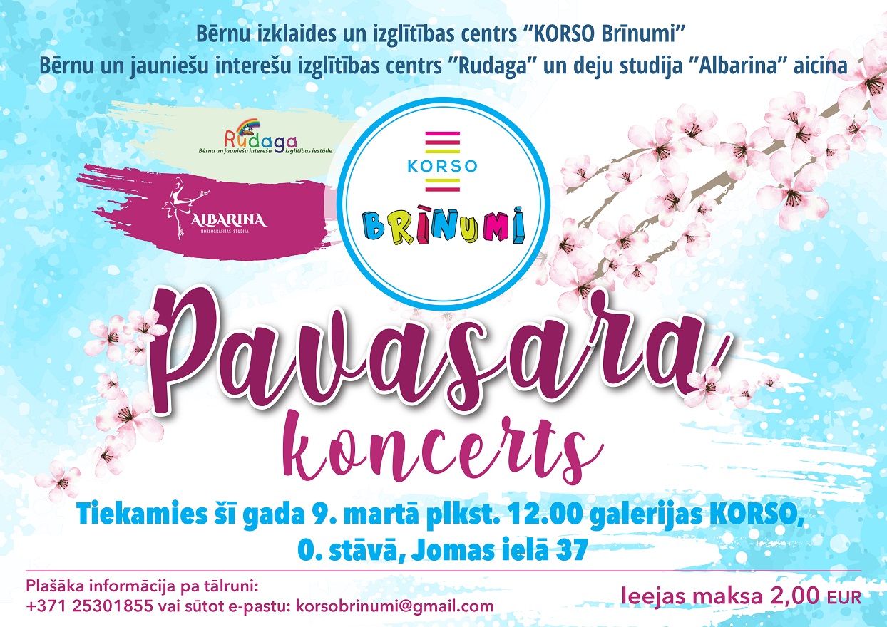 Bērnu izklaides un izglītības centrs KORSO Brīnumi Jūrmala, bērnu un jauniešu interešu izglītības centrs Rudaga un Horeogrāfijas studija Albarina aicina uz KORSO Brīnumi Pavasara koncertu! Tiekamies 9. martā plkst. 12.00 galerijas Korso, 0.stāvā.