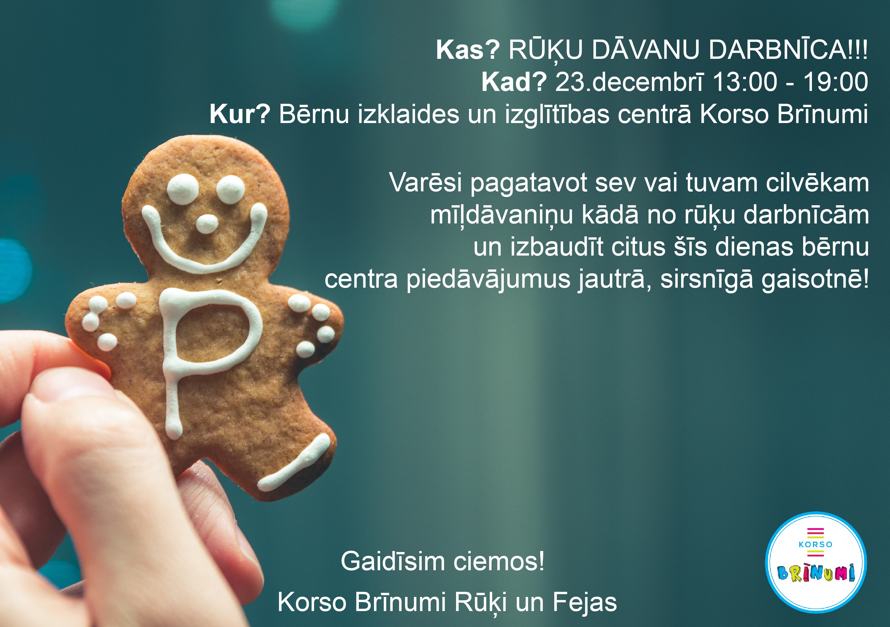 23.decembrī 13:00-19:00 bērnu izklaides un izglītības centrā KORSO Brīnumi Jūrmala notiks rūķu dāvanu darbnīca! Plašāka informācija: +371 25301855. Gaidīsim ciemos!