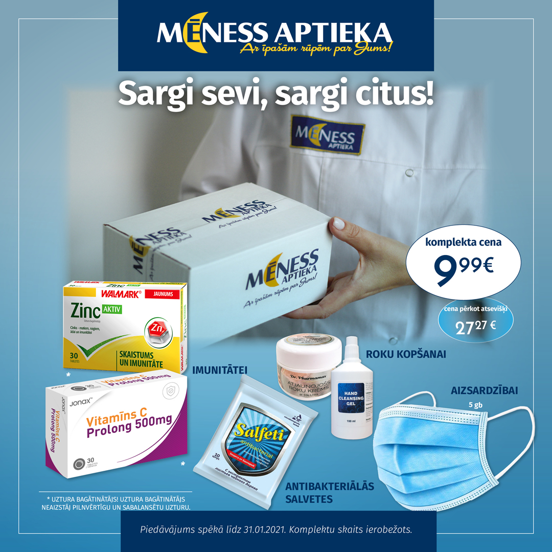 Mēness Aptieka farmaceiti ir sakomplektējuši veselībai noderīgu aptiekas produktu paku, aicinot iedzīvotājus izmantot visas pieejamās iespējas drošai ikdienai un veselības saglabāšanai.