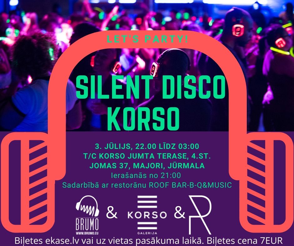 Pirmo reizi Jūrmalā - SILENT DISCO KORSO uz lielākās, atvērtās jumta terases Jūrmalā! Lieliska mūzika katrai gaumei, vasaras vakara burvība, svaigais jūras gaiss ir tas, kas jāizbauda katram šajā vasarā. Tā ir diskotēka, kas ir domāta ik vienam! Diskotēka, kurā nav jāpiepūlē balss saites, lai kaut ko pateiktu draugam, kliedzot! Diskotēka, kur valda tikai jautrība un pozitīvas emocijas! Vai tas ir iespējams? Jā! Tas ir iespējams apmeklējot – SILENT DISCO jeb Kluso Diskotēku. Klusajā Diskotēkā tiek izmantotas speciālas bezvadu austiņas, kur katrs var individuāli regulēt austiņās skanošās mūzikas skaļumu, kā arī izvēlēties DJ, kura muzikālā gaume sakrīt ar jūsējo. Pateicoties speciālajām austiņām, vienlaicīgi vienā pasākumā spēlēs divi DJ un katrs dejotājs noteikti atradīs sev piemērotu mūziku. Šoreiz DJ piedāvās Latviešu deju mūziku, Retro Hiti 70’-90’ gadi un pēdējo 10 gadu EDM, House un R&B mūzikas stilus.