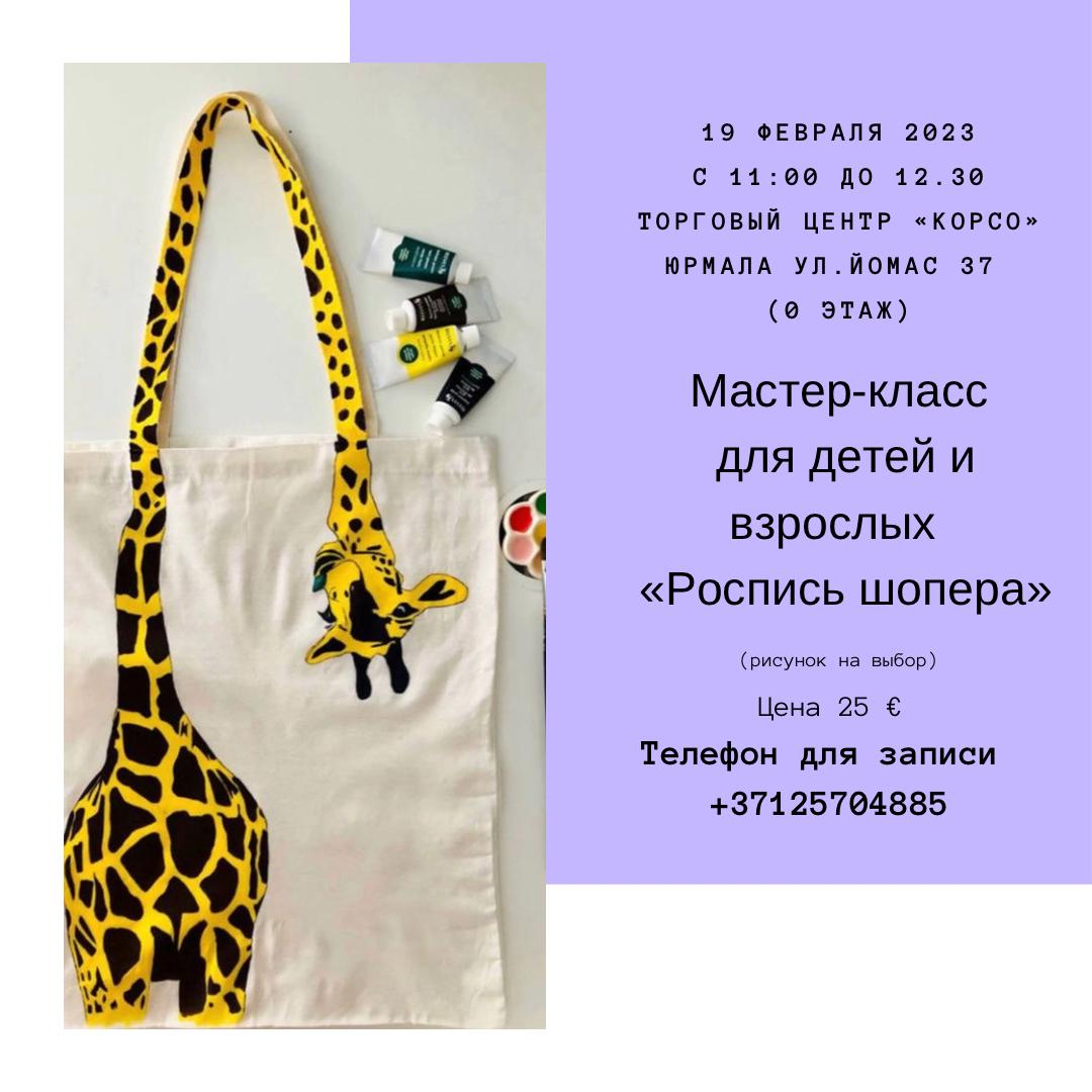 Šo svētdien plkst. 11.00 aicinām bērnus un vecākus uz meistarklasi, kurā izgatavosim apgleznotas somas ar paša izvēlētu zīmējumu. Pieteikšanās pa tālruni 25704885 Nodarbības maksa 25eur.