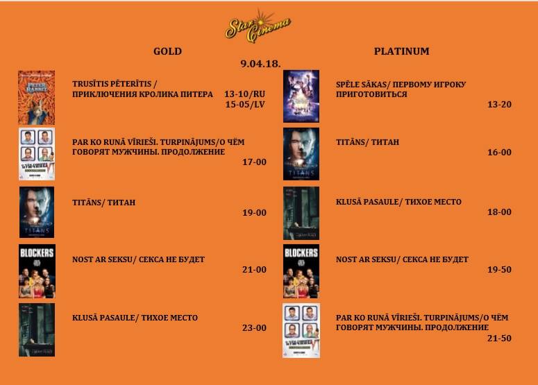 Filmu saraksts 9.04. kinoteātrī Star Cinema Jūrmala