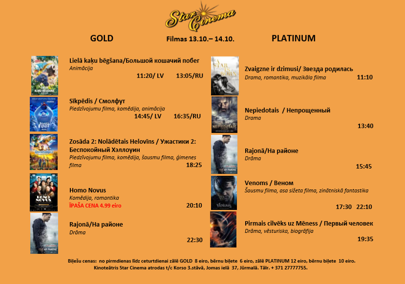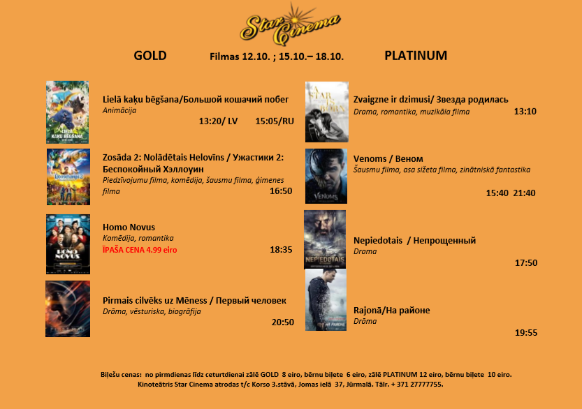 Filmu saraksts (12.10.-18.10.) kinoteātrī Star Cinema Jūrmala.