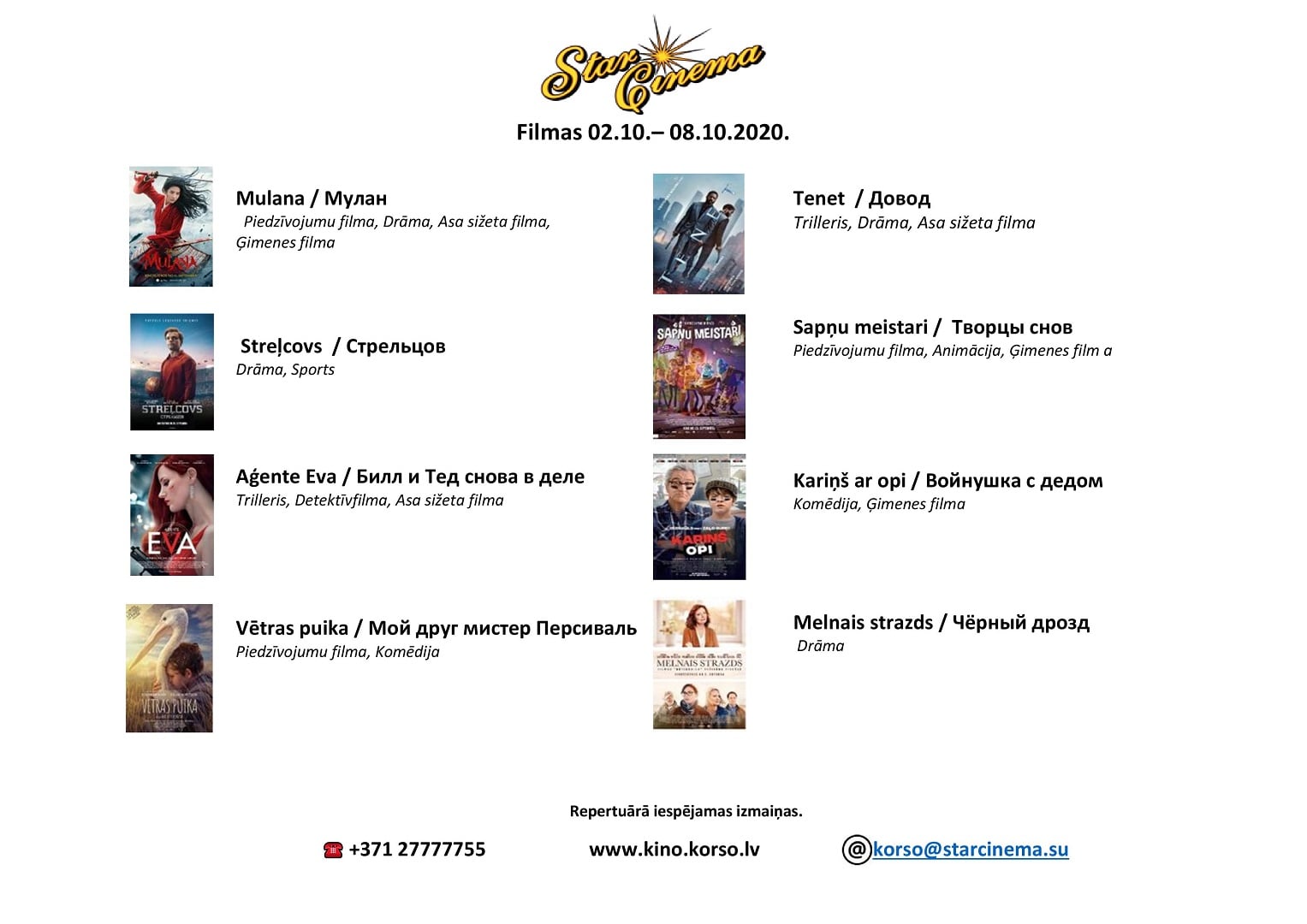FILMAS (02.-08.10.2020.) kinoteātrī Star Cinema Jūrmala. Sīkāk kino MĀJAS LAPĀ ➡ kino.korso.lv