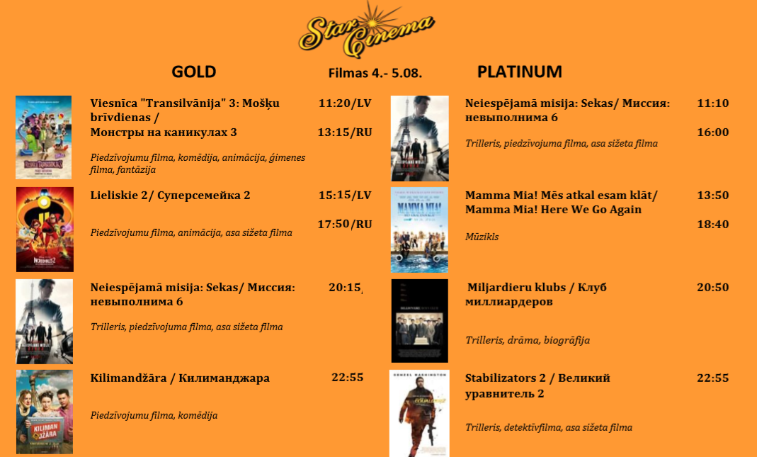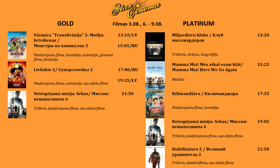 Filmu saraksts (3.-9.08.) kinoteātrī Star Cinema Jūrmala.