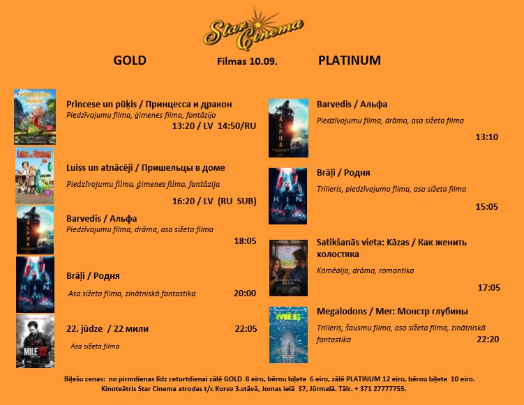 Filmu saraksts (7.09-13.09.) kinoteātrī Star Cinema Jūrmala.