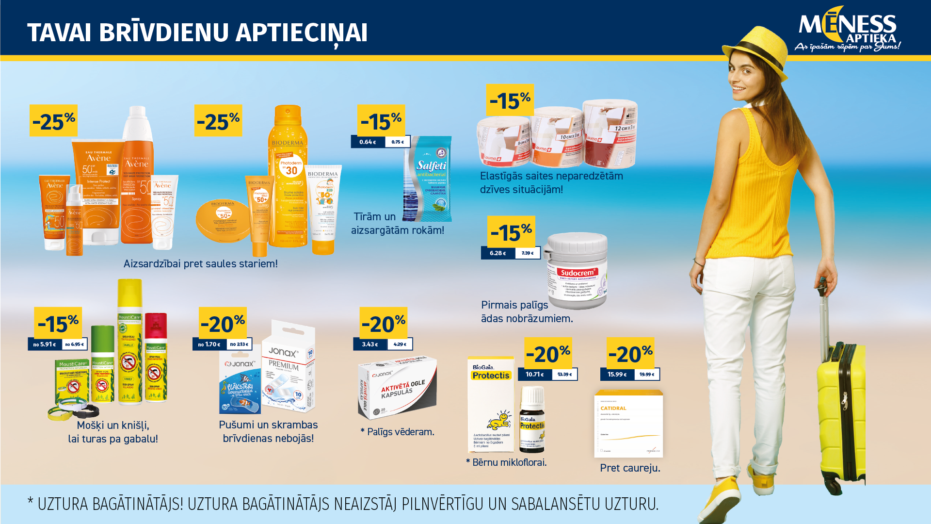 Jūlijs ir atnesis ne tikai burvīgi karstu laiku, bet daudziem tas ir arī atvaļinājumu laiks. Tāpēc Mēness Aptieka ir sagatvojusi īpaši izdevīgas atlaides, lai jums būtu viss nepieciešamais jūsu brīvdienu aptieciņai!