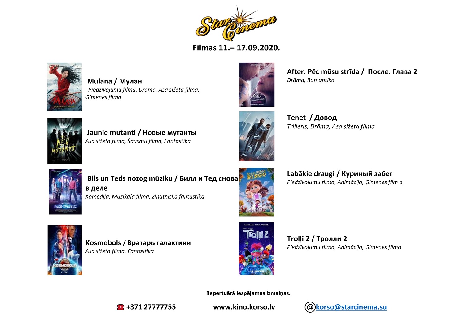 FILMAS (11. - 17.09.2020.) kinoteātrī Star Cinema Jūrmala. Sīkāk kino MĀJAS LAPĀ ➡ www.kino.korso.lv