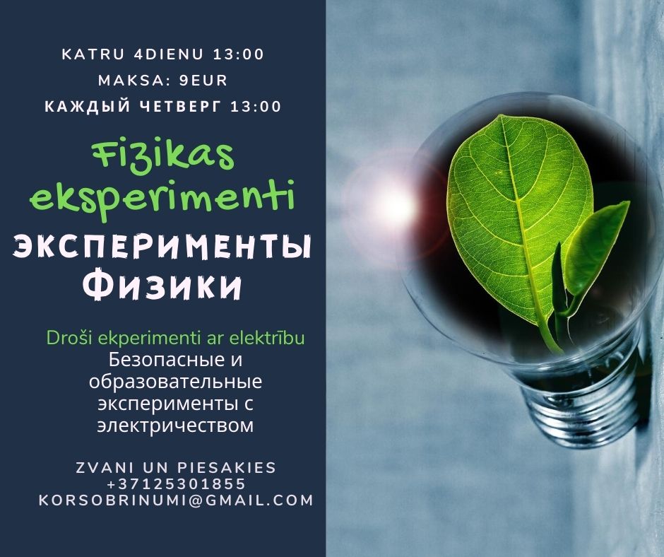 Ceturtdienās 13:00 Radoši, aizraujoši, droši eksperimenti ar elektrību puišiem un meitenēm. Nāc un iepazīsti pasauli sev apkārt! Zvani vai raksti un piesakies! +371 25301855 korsobrinumi@gmail.com