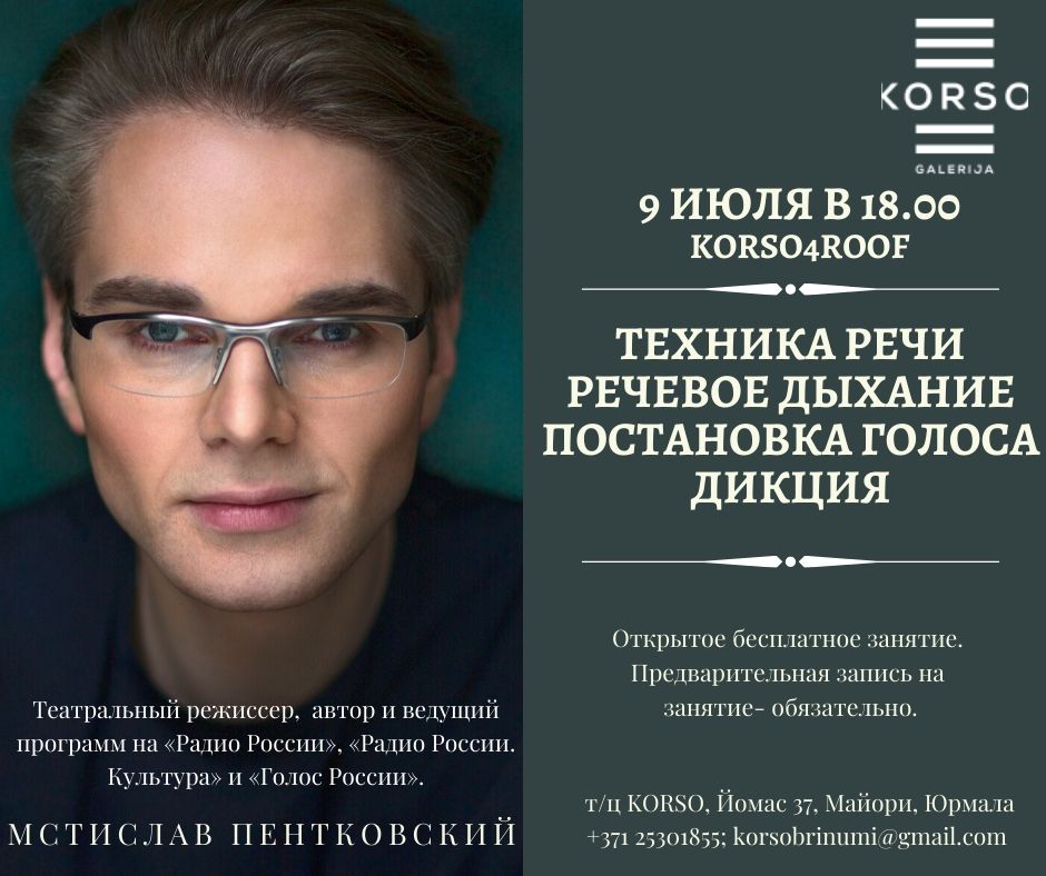 Teātra režisors, autors un programmu vadītājs Mstislavs Pentkovskijs (Мстислав Пентковский) ielūdz uz runas meistarklasi, kas notiks 9. jūlijā plkst. 18.00, galerijas Korso 0.stāvā. (ja laikapstākļi būs labvēlīgi, tad uz 4.stāva terases). Pirmā iepazīšanās nodarbība bez maksas. Nodarbība notiek krievu valodā.