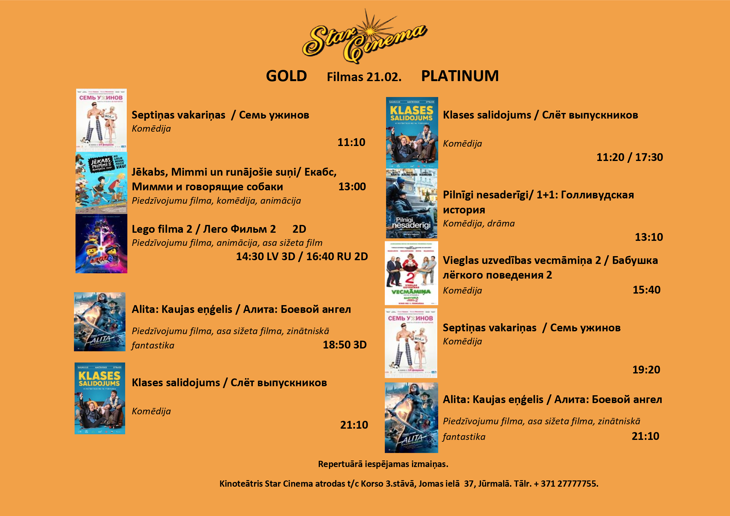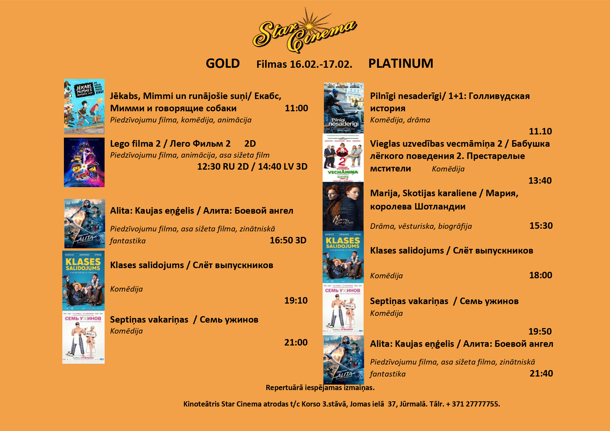 Filmu saraksts (11.02. - 14.02.2019) kinoteātrī Star Cinema Jūrmala