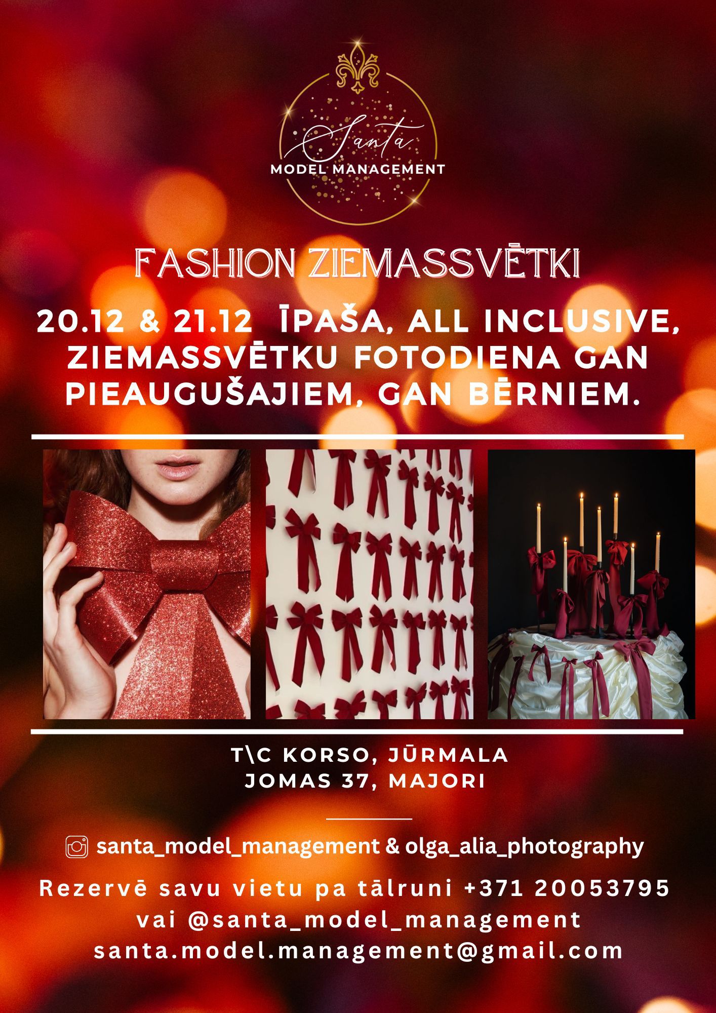 Santa Model Management rīko tematisku foto-sesiju "Fashion Ziemassvētki", 20. un 21. decembrī t/c Korso. Foto-sesijā ir viss iekļauts - profesionāli fotogrāfa un vizāžista pakalpojumi, kā arī tērpi no Klerr un Sky&More un artdirektores Santas Taukachas vadība. Vietu skaits ir ierobežots, tāpēc rezervē savu laiku jau tūtīt.