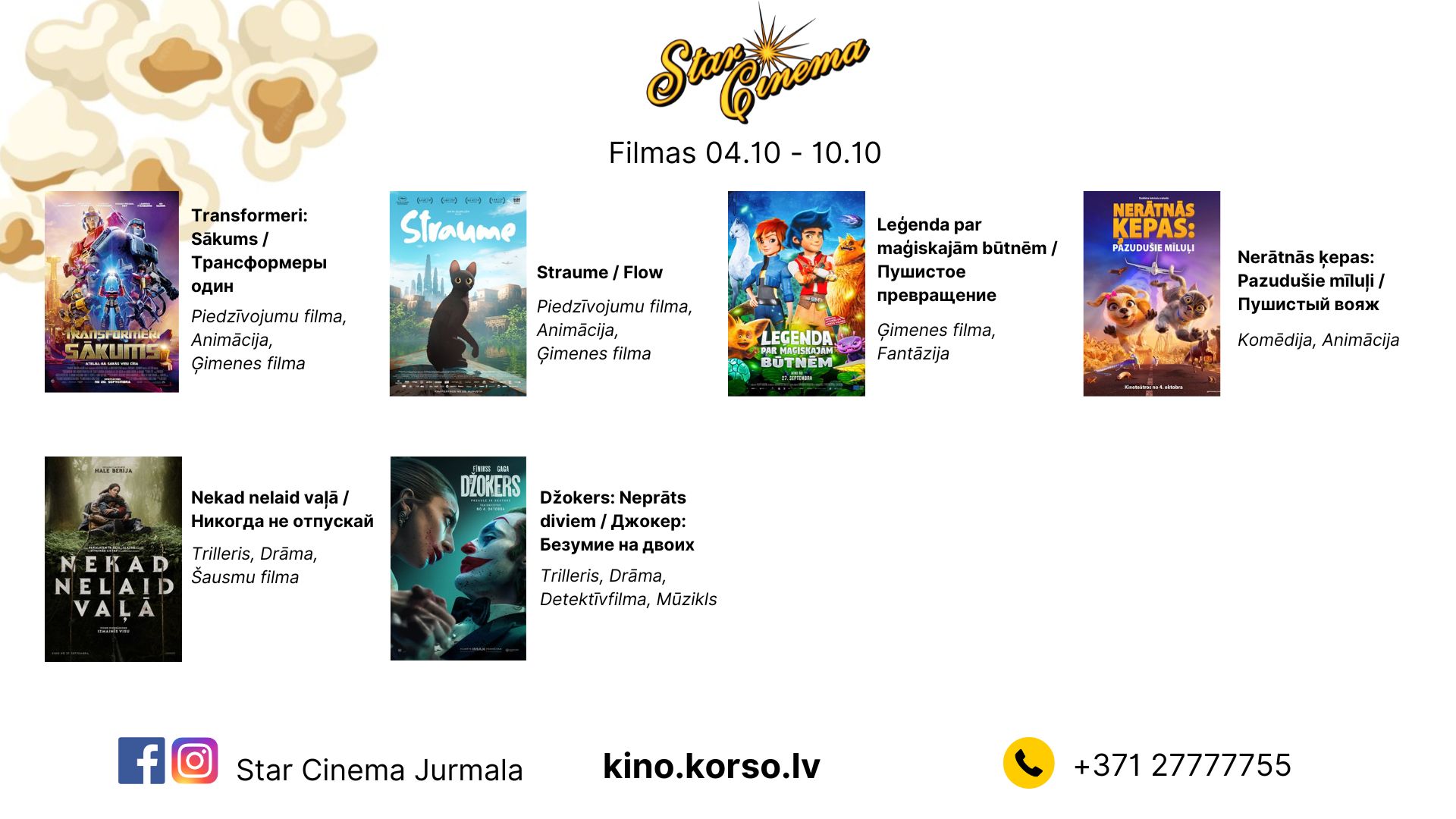 Visas jaunākās filmas vienuviet, mājīgākajā kinoteātrī Jūrmalā! Rezervē savu biļeti uz filmu zvanot +371 27777755 vai epastā korso@starcinema.su