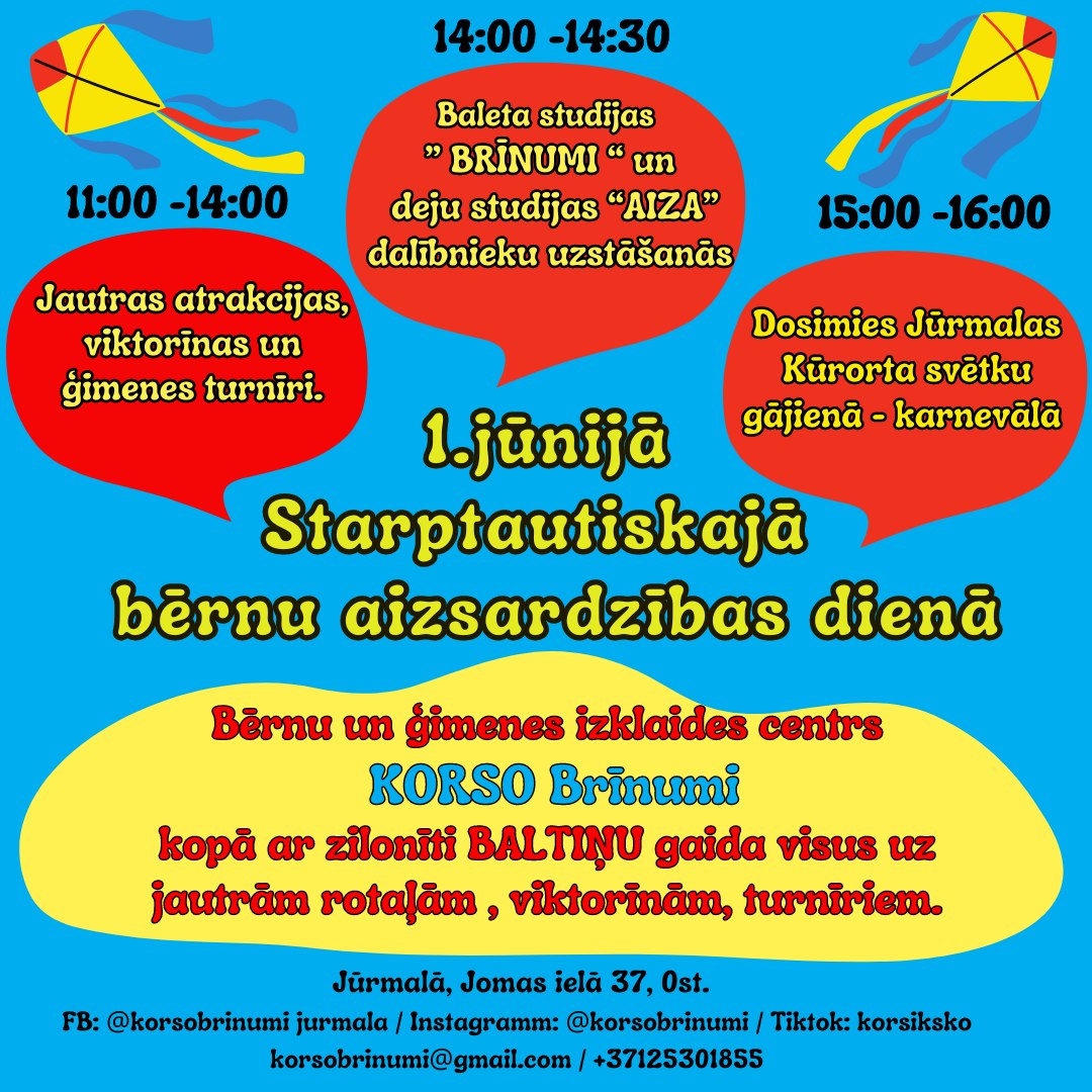 Starptautiskajā bērnu aizsardzības dienā 1. jūnijā - bērnu izklaides un izglītības centrs Korso Brīnumi gaidīs ciemos ģimenes ar bērniem uz jautrām atrakcijām, viktorīnām, turnīriem.