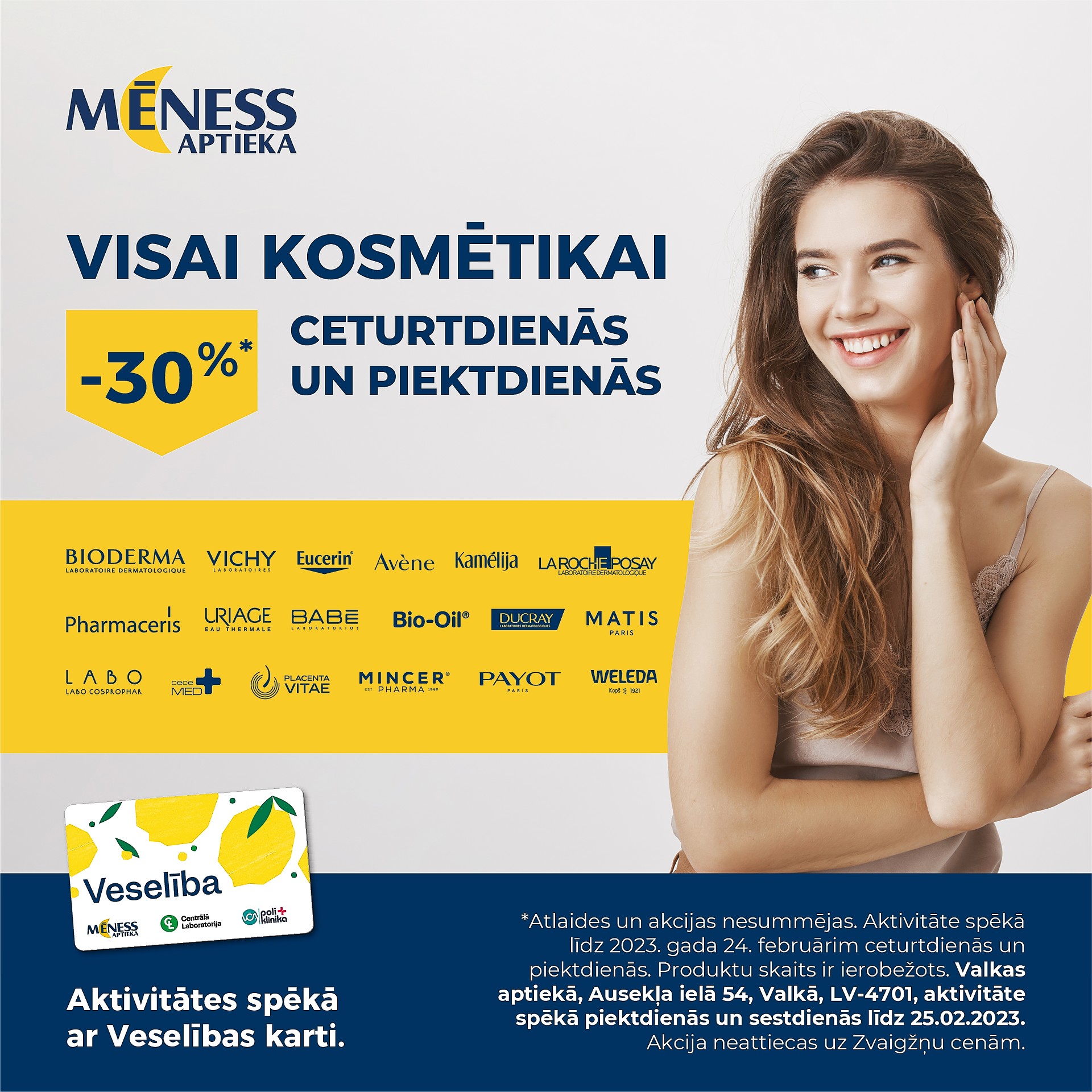Arī šogad, katru ceturtdienu un piektdienu visiem kosmētikas produktiem 30% atlaide! Iegādājies savus iecienītos zīmolus par vēl izdevīgākām cenām. Piedāvājums spēkā visās Mēness aptiekās Latvijā!