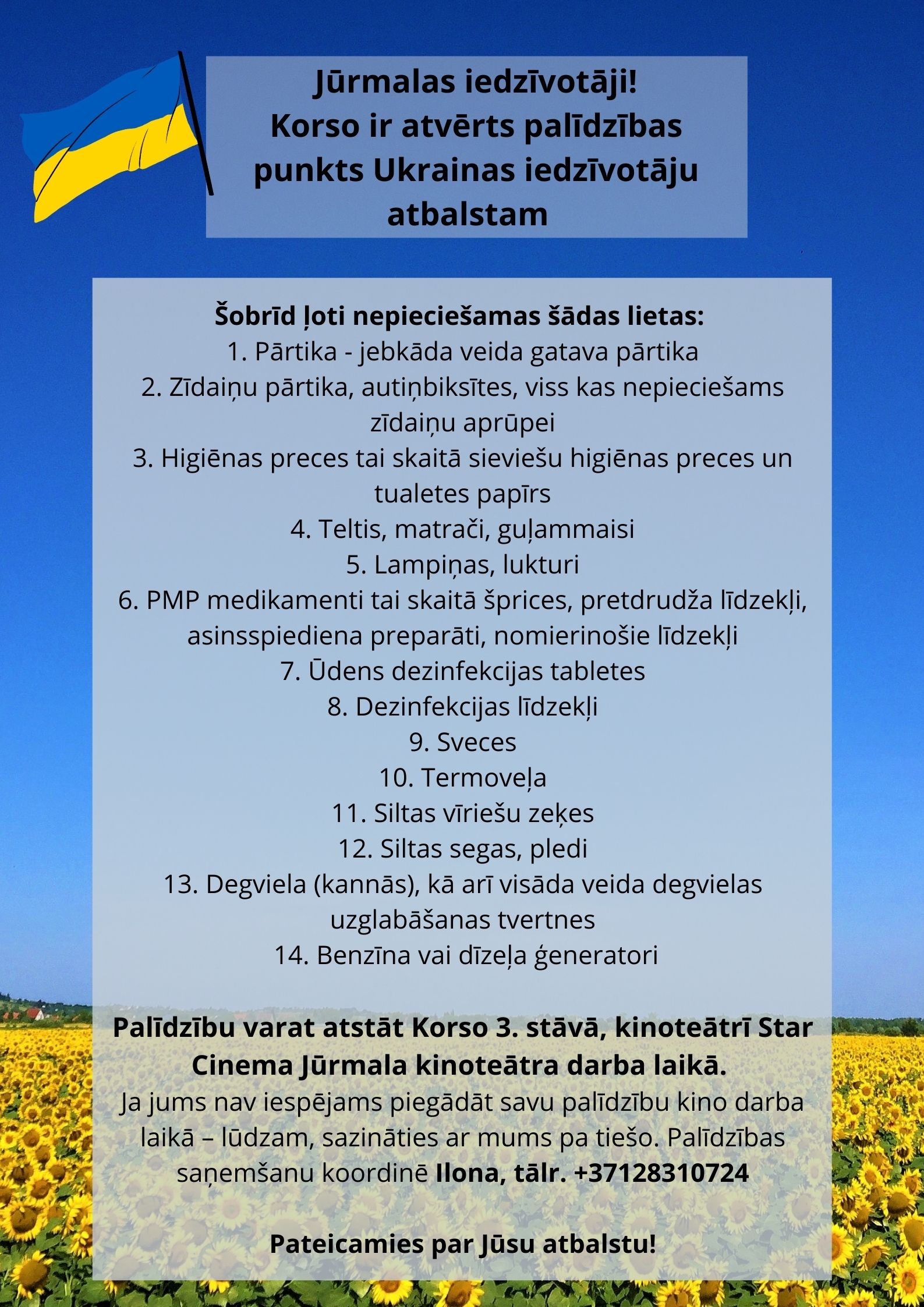 Jūrmalas iedzīvotāji! Vēlamies jūs informēt, ka sākot no šodienas, 09.03.2022. esam atvēruši Korso palīdzības punktu Ukrainas iedzīvotāju atbalstam.